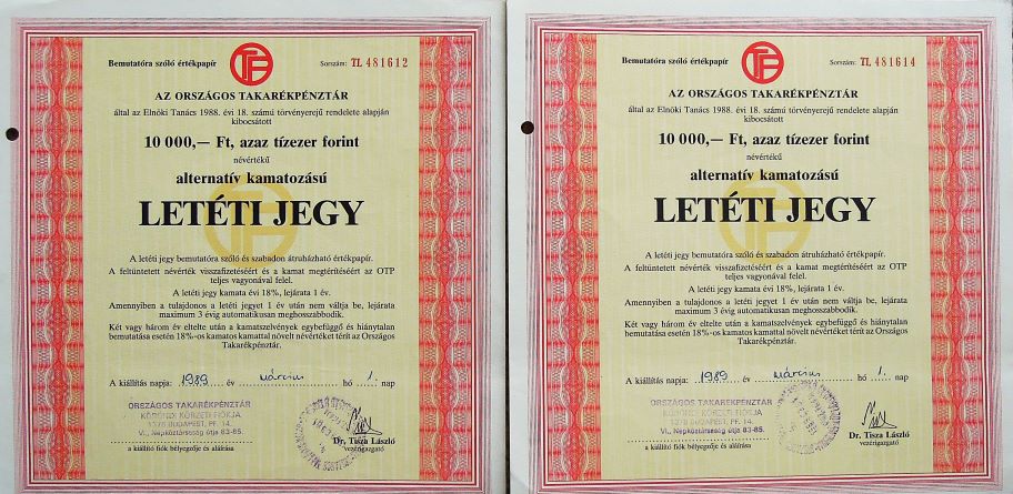 10.000 Ft OTP Letéti jegy 1989. Eladó. Darabár. Ár: 150 Ft/db