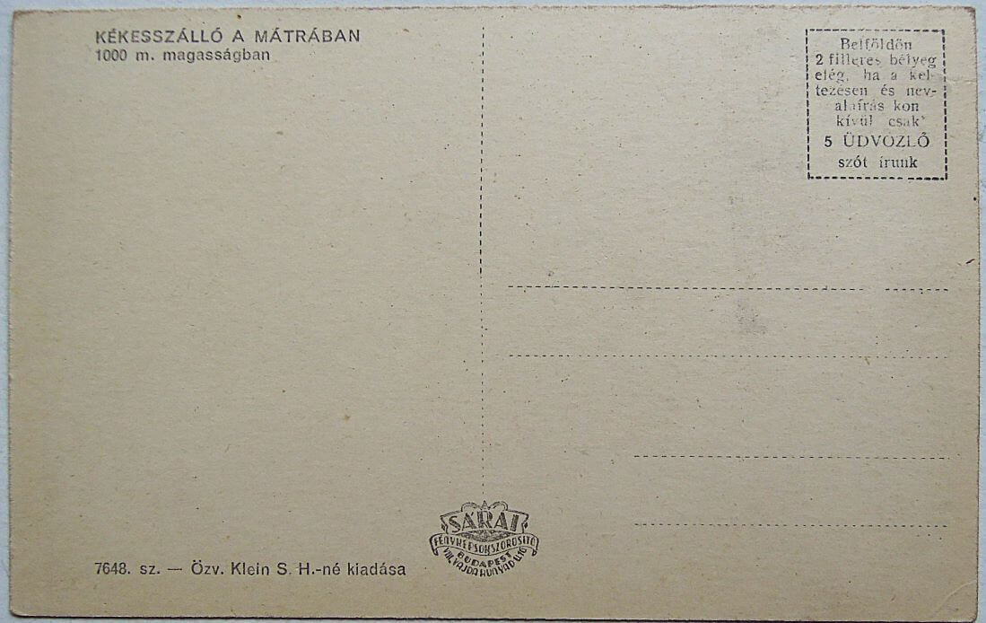 Kékes Szálló a Mátrában 1000 m magasságban Sárai képeslapKékes Szálló a Mátrában 1000 m magasságban Sárai képeslap. Sárai fényképsokszorosító. Özv. Klein S. H. -né kiadása. Eladó. Ár: 250 Ft
